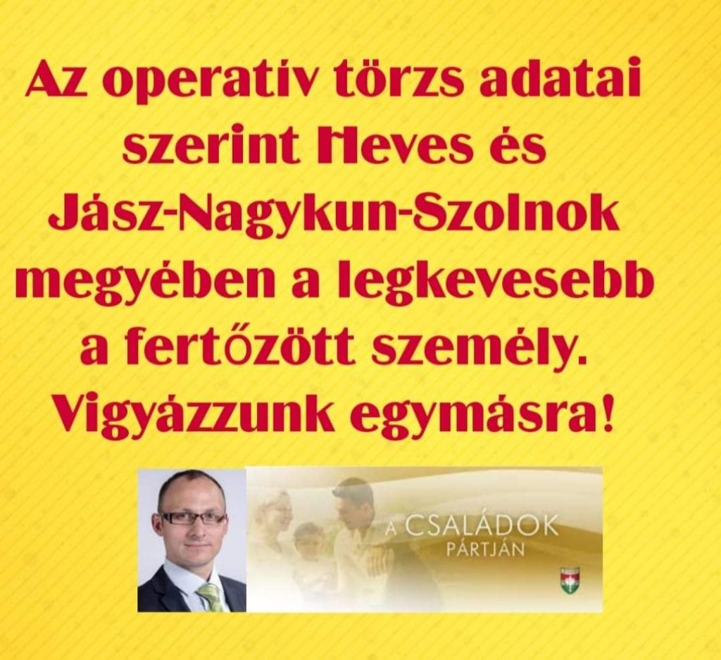 Az operatív törzs adatai szerint Heves és Jász-Nagykun-Szolnok megyében a legkevesebb a fertőzött személy. Vigyázzunk egymásra!