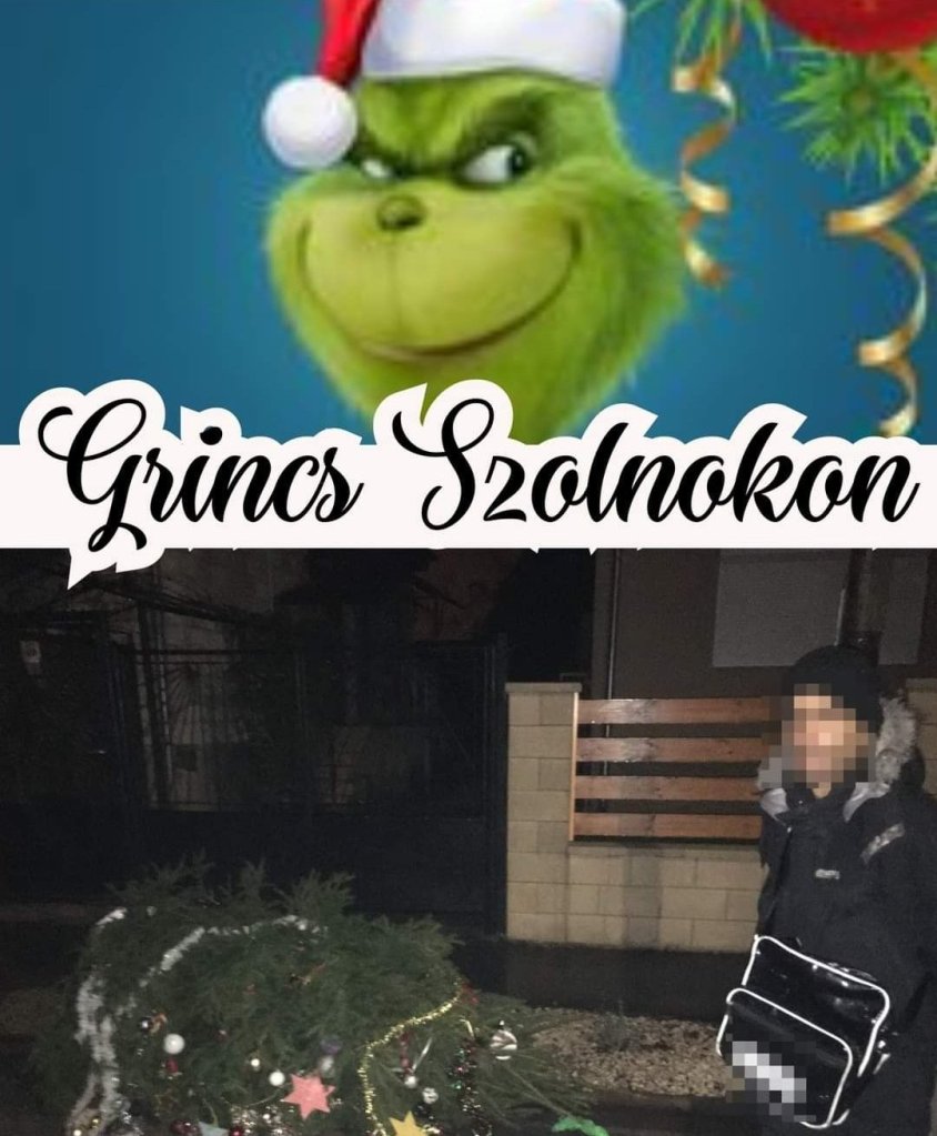 Egy szabadnapos kollégánk december 6-án egy furcsa jelenet szemtanúja lett. Egy férfi az orra előtt húzott a földön egy feldíszitett fenyőfát. A rendőr az első sokk után megállította a Grincset, aki a Szolnok Pletykafalu Közössége Egyesület karácsonyfáját akarta éppen hazahúzni. A díszek bár összetörtek, de a fa legalább visszakerülhetett a helyére, a Grincs ellen pedig eljárás indult.